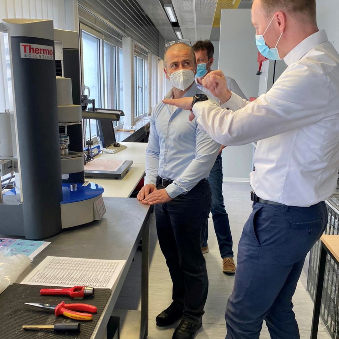 Vorstandsvorsitzender Nico Laufer und Stellvertretender Institutsleiter Dr. Volker Weißmann konnten am 01. Juli die Arbeits- und Forschungsschwerpunkte des IPT²s präsentieren. Die Entwicklung von Kunststoffen mit kundenspezifischen Eigenschaften, die Herstellung spezieller Filamente für die additive Fertigung und die Verbesserung der biologischen Abbaubarkeit und dem Recycling von Kunststoffen für die Industrie, waren nur einige der vorgestellten Arbeitsfelder des Institutes. |